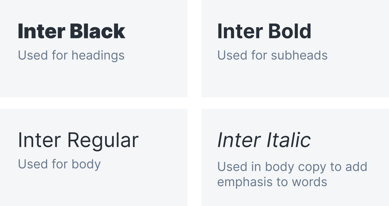 We use Inter in the product and for all marketing collateral. For our marketing material, Inter Black is our preferred header, and Inter Regular is used for body copy. We also use Inter Bold and Semi Bold for subheaders and highlights.