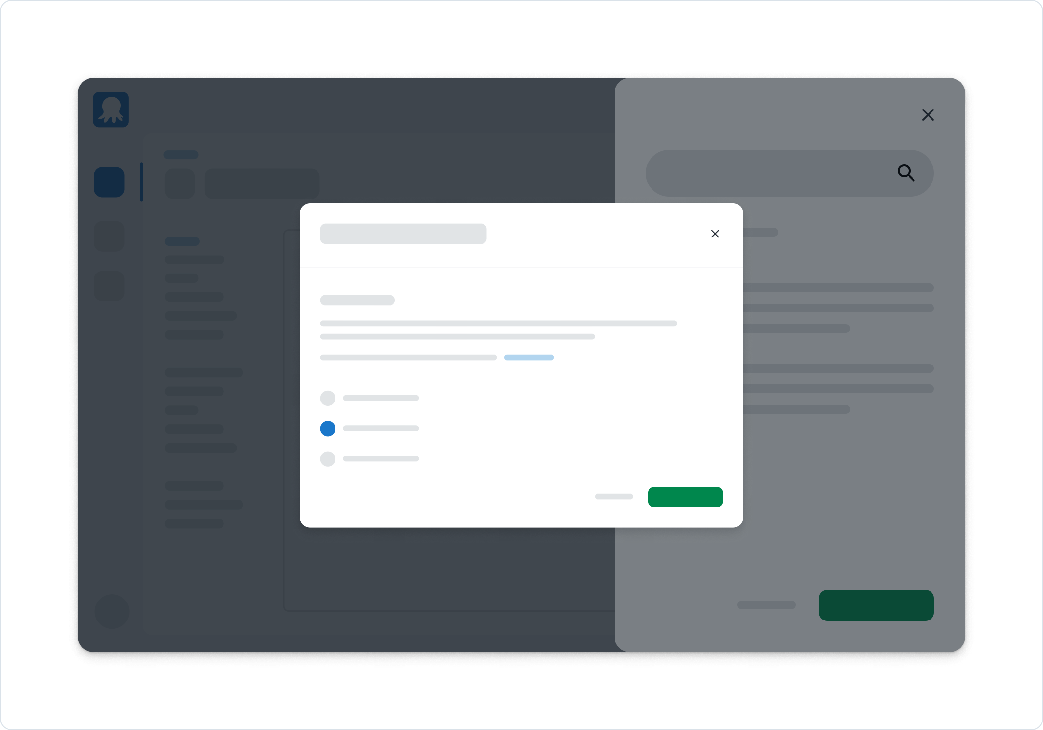 Overlays, including dialogs, onboarding dialogs, drawers, and wizards, are pop-up layers that sit on top of the main interface. They allow us to request a decision from the user, provide critical information, or guide actions without overwhelming users.